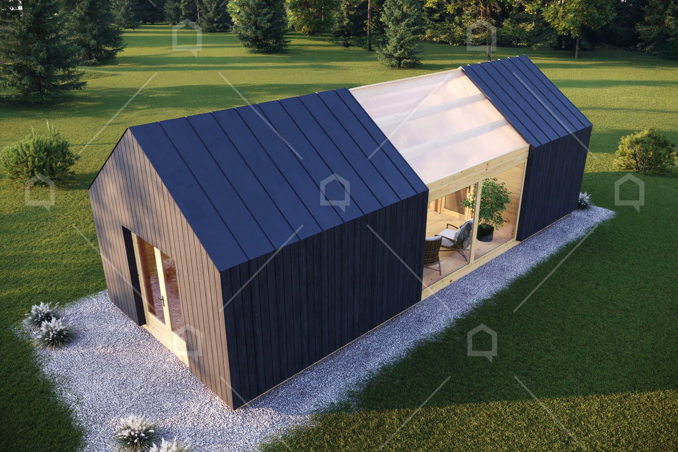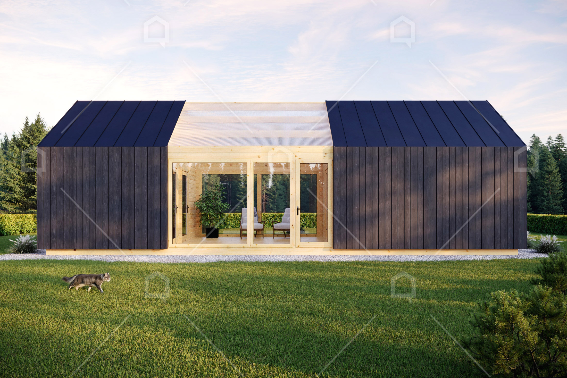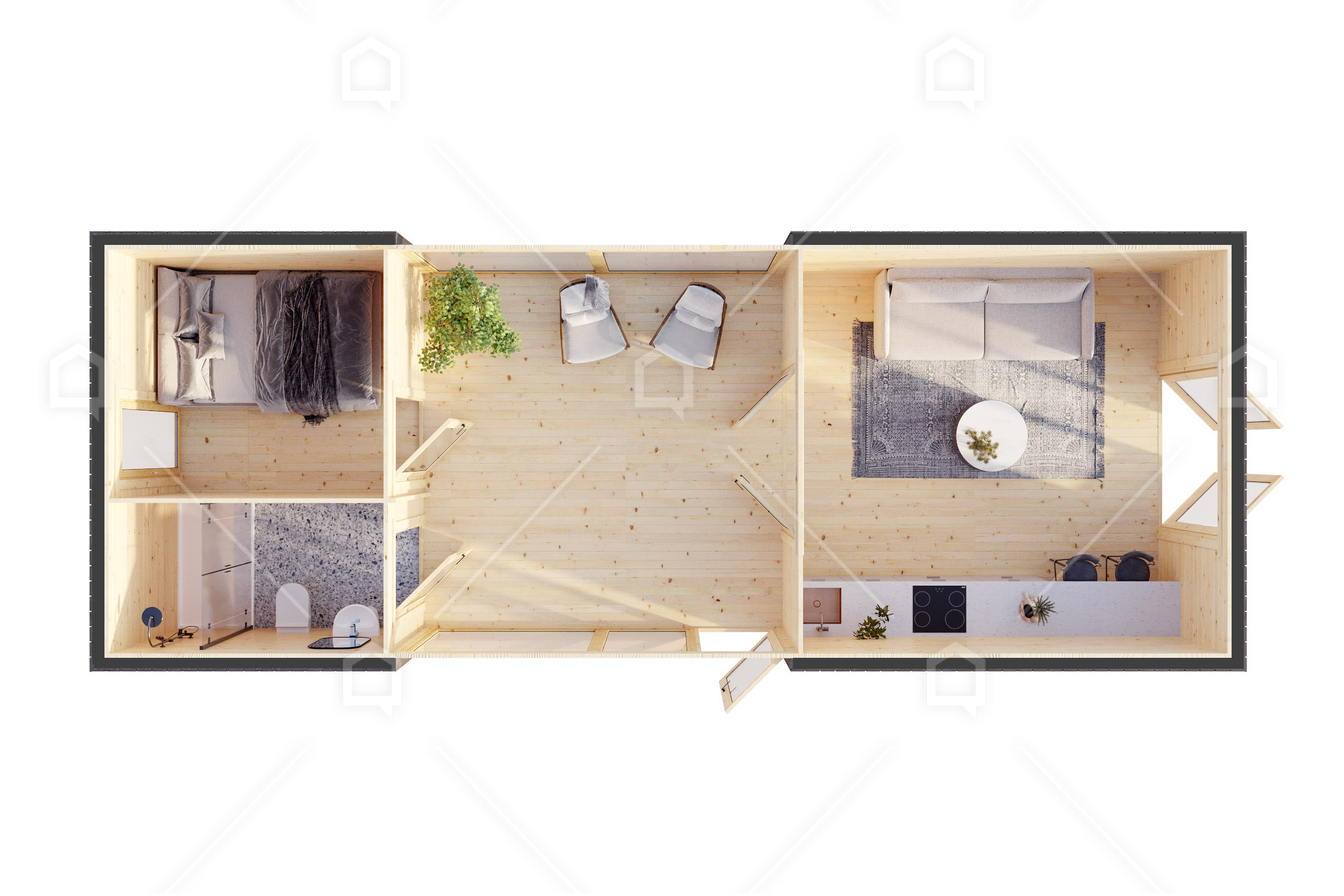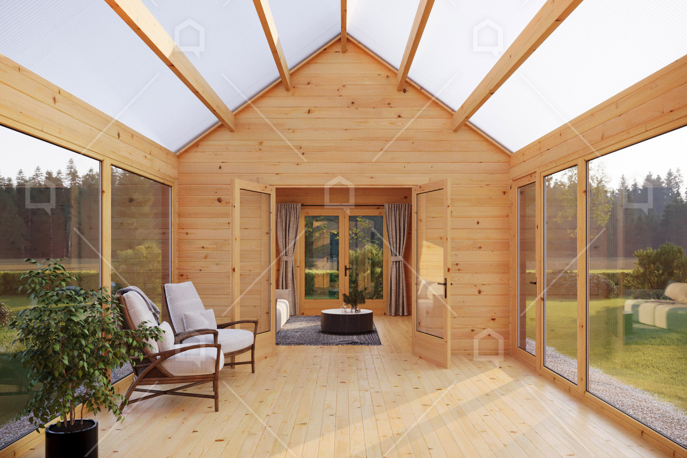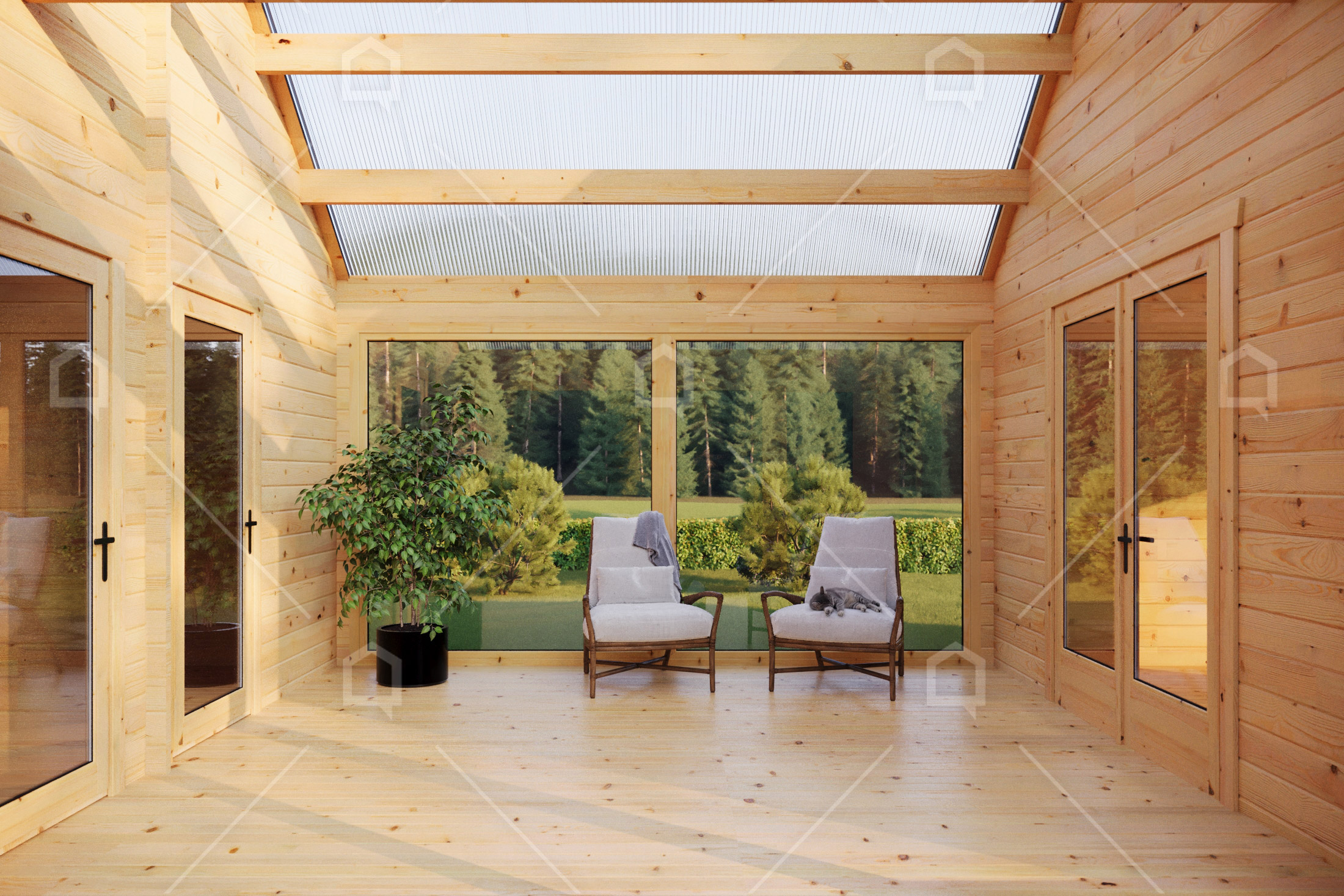 Na jedné straně domu se nachází kompaktní ložnice s koupelnou a toaletou, zatímco na druhé straně je společná kuchyň a obývací prostor. Dřevěný letní dům se vyznačuje prosklenou terasou o rozloze téměř 16 m², kterou lze přizpůsobit libovolnému využití, například poskytnout pracovní i odpočinkovou zónu. Pokud je terasa využívána k práci, lze na ni umístit všechny nezbytnosti, jako je stůl se židlí, police na dokumenty nebo věci. V případě potřeby lze terasu přeměnit na volnočasovou zónu pro pořádání večírků nebo odpočinek, kde bude umístěna pohovka se stolem a židlemi a jídelní stůl se židlemi. Terasu lze také využít k pěstování květin a mít vlastní zimní zahradu.