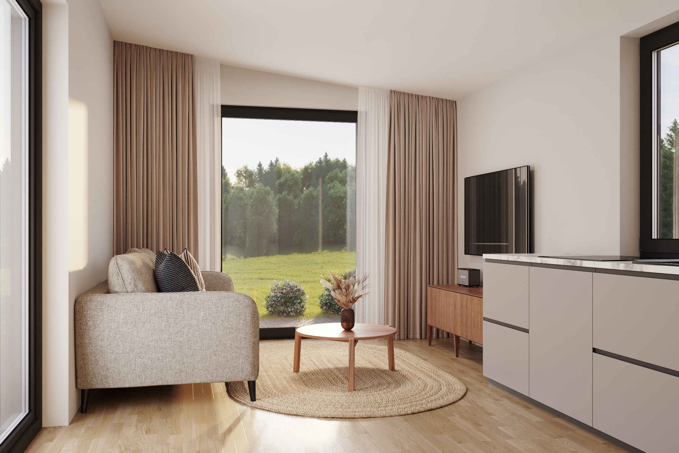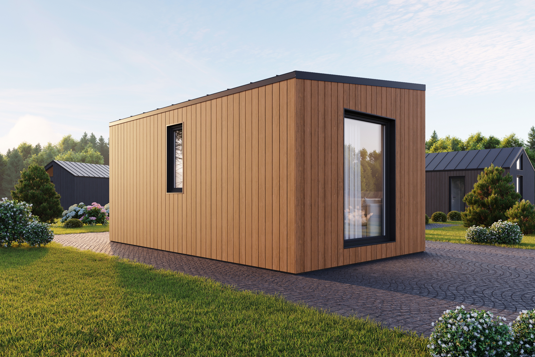 Dům se skládá z několika samostatných modulů, které vyrábíme v naší továrně a následně je sestavíme do jednoho celku. Modulární dům je na pozemek klienta dodán s hotovou vnější i vnitřní povrchovou úpravou, kuchyní a sanitární zónou.