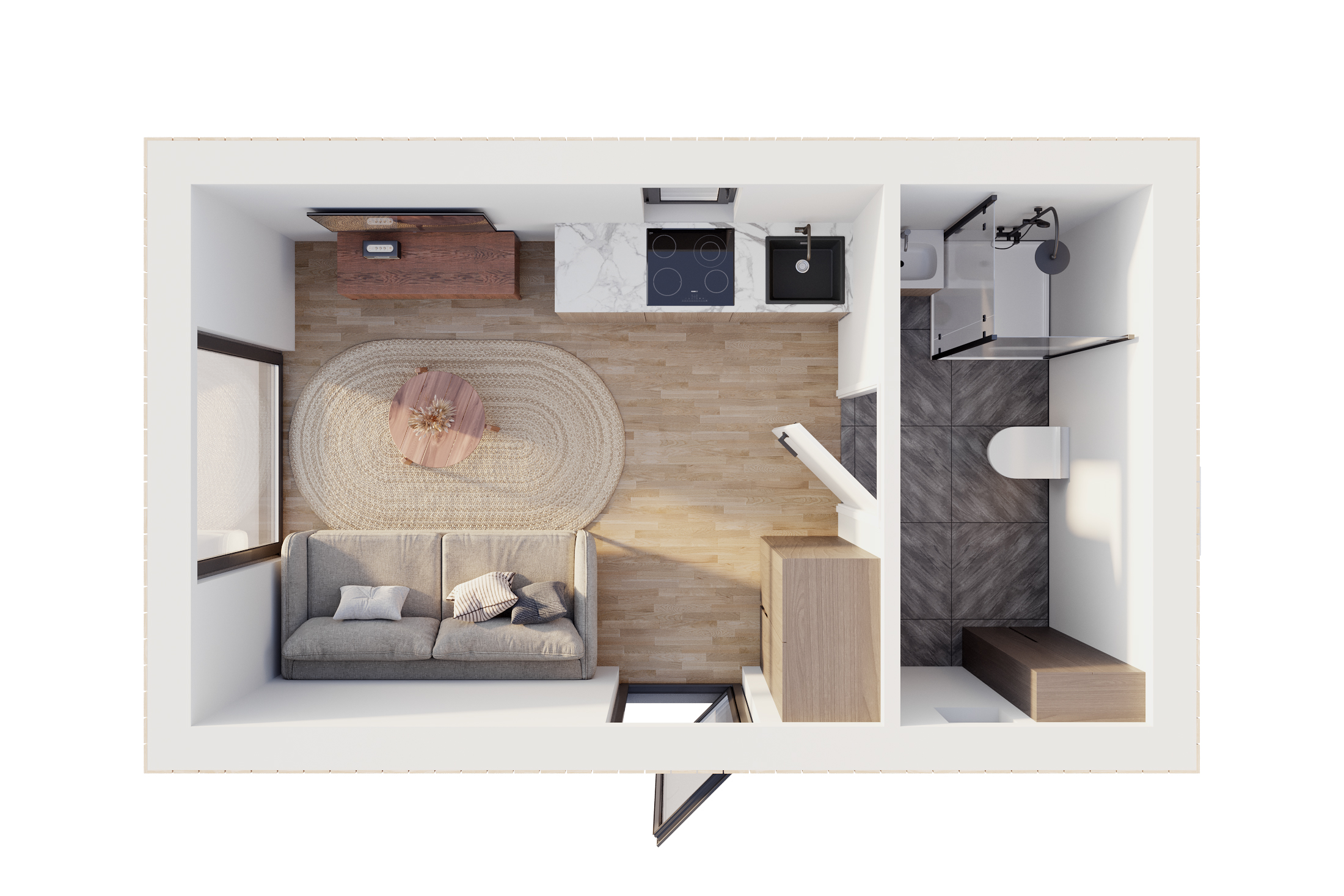 Dispozice domku se skládá z obývacího–jídelního prostoru, kde se můžete setkávat s blízkými nebo trávit klidné večery, a z pohodlné koupelny. Tento model je ideální pro pár nebo jednotlivce, kteří hledají místo k odpočinku uprostřed přírody. Přestože Lotus nemá samostatnou ložnici, v obývacím pokoji lze umístit pohodlnou pohovku, která v případě potřeby slouží jako další lůžko. Dům poskytuje velkou flexibilitu – prostor pro stolování, relaxaci nebo pracovní koutek lze snadno přizpůsobit vašim potřebám.
