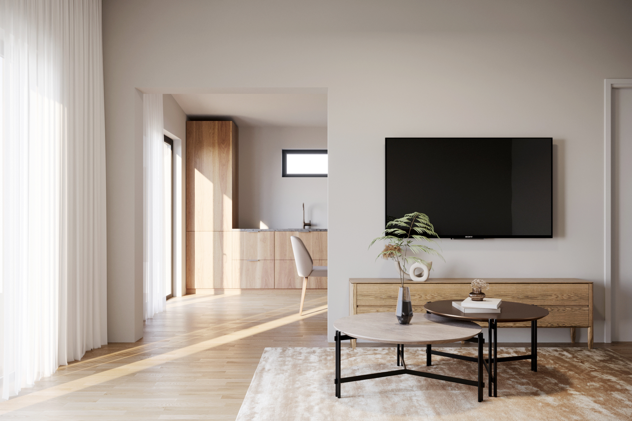 Noto harmonicky spojuje funkčnost a styl – dvě ložnice, prostorný obývací pokoj a jídelní část umožňují pohodlné bydlení se vším, co je potřeba. Ložnice poskytují klid a soukromí, zatímco společná zóna s obývacím pokojem a jídelnou je ideálním místem pro rodinné večery, setkávání s přáteli nebo prostý odpočinek. Tento dům doslova vybízí k nastěhování a užívání si jednoduchého, ale kvalitního života.