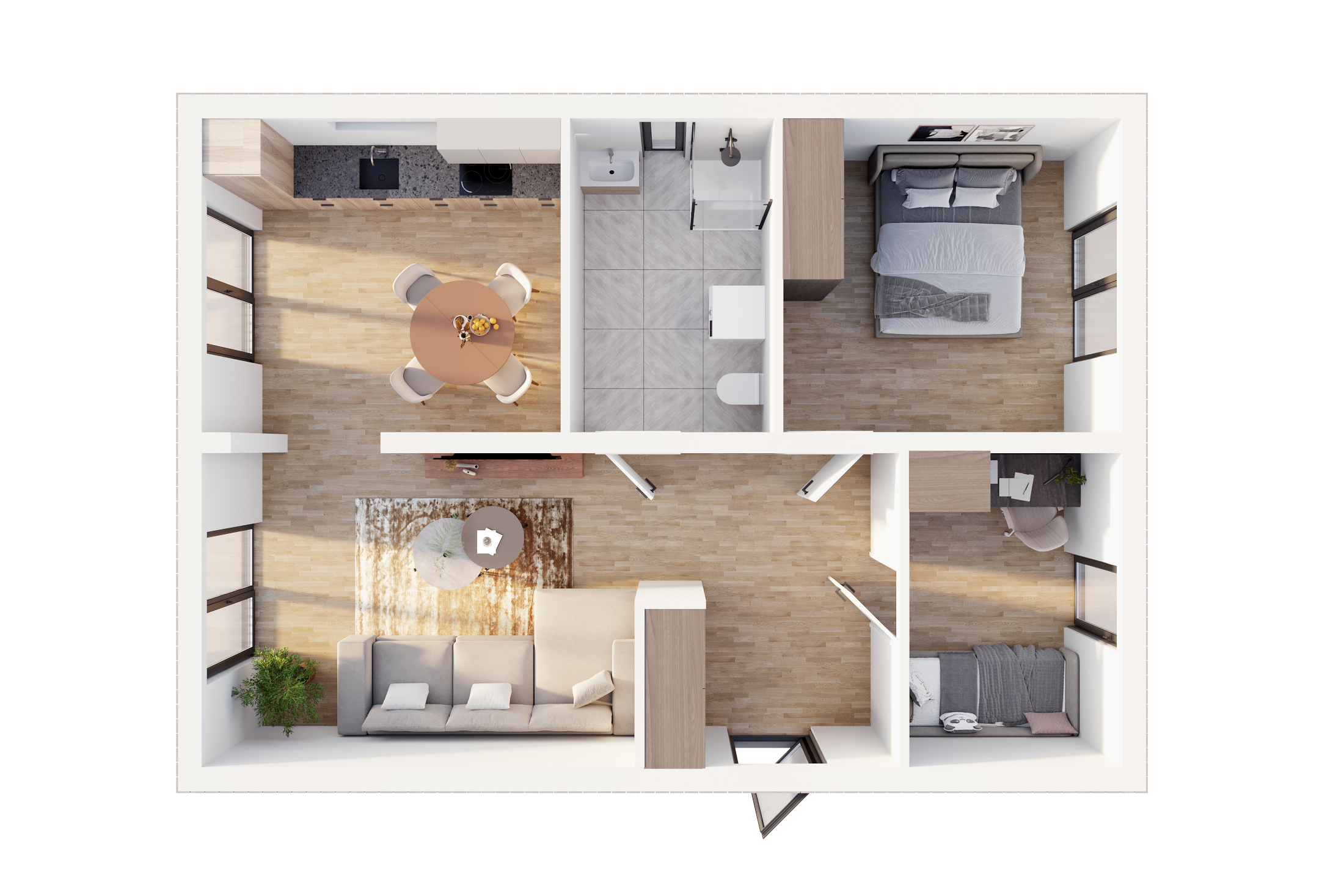 Projekt Noto je skvělou volbou pro ty, kteří hledají prostor a pohodlí, ale zároveň se nechtějí vzdát moderního a elegantního vzhledu. S podlahovou plochou 60,5 m² nabízí Noto dostatek místa jak pro odpočinek, tak pro každodenní život. Dispozice se dvěma ložnicemi zajišťuje komfort a pocit soukromí, takže tento dům je ideální pro menší rodiny nebo pro ty, kteří si cení vzdušných a útulných interiérů.