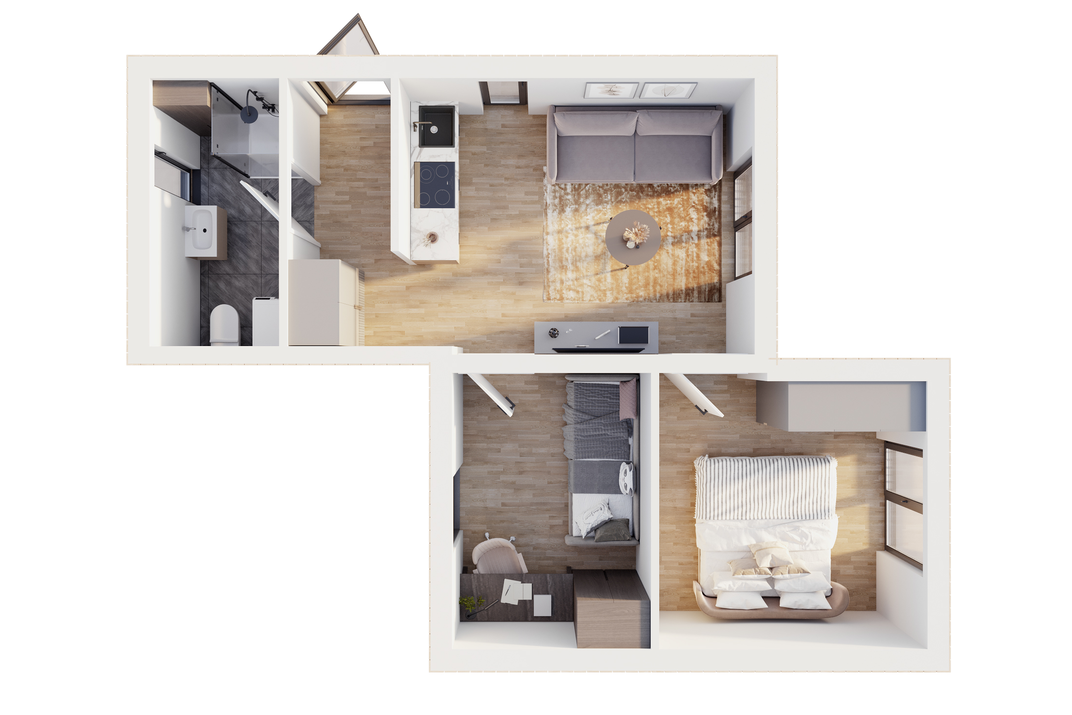 Serenity harmonicky spojuje kompaktní rozměry a funkčnost. Otevřený prostor obývacího pokoje s kuchyní působí vzdušně a pohodlně, zatímco ložnicová část zajišťuje klid a pocit soukromí. Tento domek je vhodný pro páry, malé rodiny nebo pro všechny, kteří chtějí bydlet pohodlně, aniž by svůj prostor zbytečně zahltili.